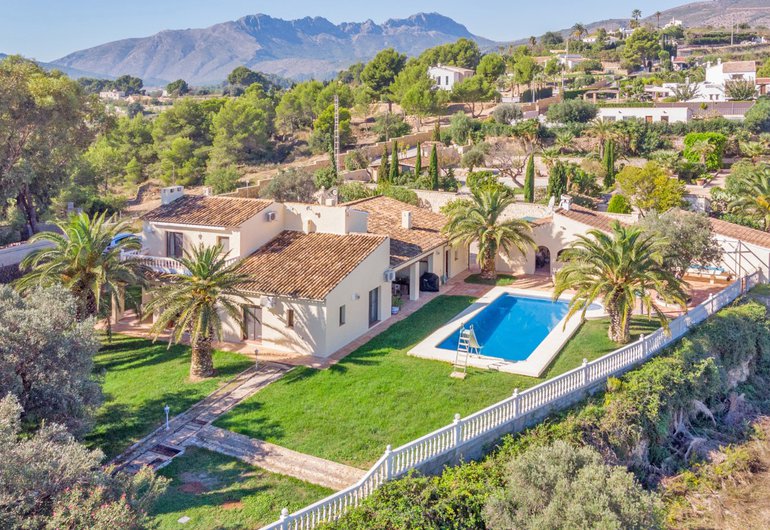 Lovely private finca with a separate guest house, both with a lovely mountain and country view near Benissa with a plot of over 21.000 m2. The finca has a constructed area of 310 m2 and the separate guest house 220 m2. The main house will offer kitchen, living/dining room, 4 bedrooms and 4 bathrooms and the separate guest house also will have a kitchen, living/dining room, 3 bedrooms and 2 bathrooms. Both houses have a separate entrance. Furthermore, there is an outdoor kitchen and a jacuzzi in the pool area, as well as an outdoor bar and a separate sauna. The property has a large swimming pool and a lovely well-kept garden area with palms, olive trees, nut trees, orange trees etc.. There is a lot of parking space and also offers 2 garages and carport.