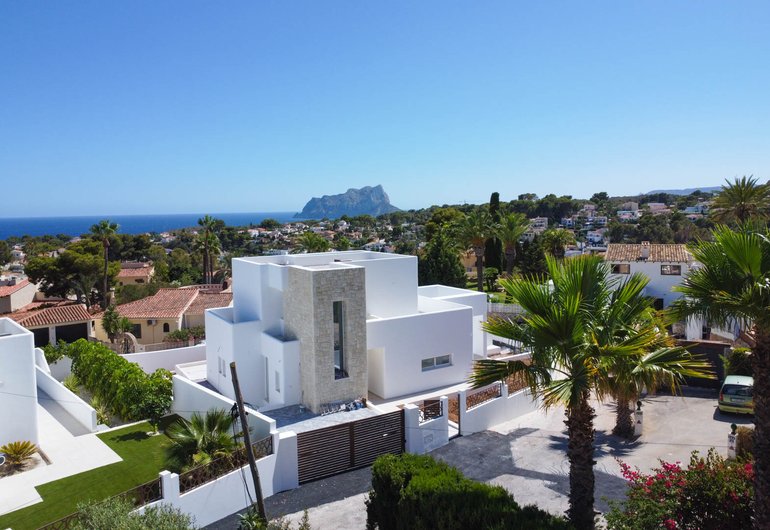 This modern villa is located on a flat plot in Benissa just 4 minutes from the beach and has beautiful views over the Peñon de Ifach and the sea. The villa is under construction and will be completed in May 2024. On the north side of the villa is the entrance where you can enter the property through both an automatic gate and a pedestrian gate. There is parking for two cars here. On the other side of the plot is another second pedestrian entrance ideal for maintenance staff. The villa is spread over two floors and has a southern orientation so you can enjoy the sun all day. The ground floor comprises a living-dining room with a spacious, open-plan kitchen with a cooking island. Adjacent to the kitchen is a laundry room. There is also a double bedroom with an en suite bathroom and a guest toilet. Both the living room and the bedroom have access to the terrace through large sliding windows. The upper floor consists of two bedrooms each with an en suite bathroom and a balcony. All bedrooms have built-in wardrobes. Both the living room and all bedrooms have underfloor heating, air conditioning and TV connection. Attached to the terrace is a large, illuminated swimming pool measuring 9.4 x 4.2m. The villa is surrounded by a garden. At a 10-minute drive you reach both the centre of Benissa and Moraira, both villages have several large supermarkets. The tourist resort of Calpe is a 15-minute drive away. Benissa is known for its crystal-clear, azure-blue beaches and there is also a beautiful walking route that leads you along several idyllic bays to Calpe.