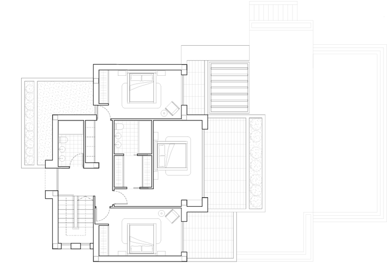 sun loungers. On the upper floor, there are three additional bedrooms (including